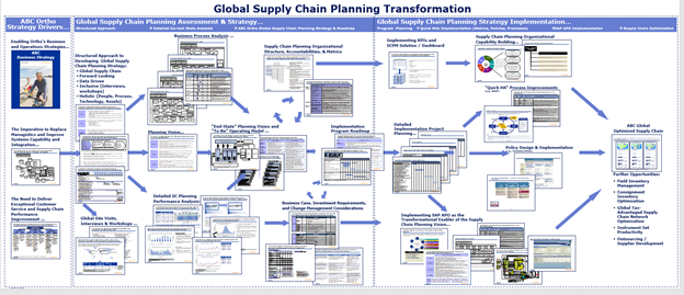 Next we perform diagnostics supply chain study to underline the benefits the business system will provide to the client. A complete value supply chain with scorecards are presented to the stakeholder for program approval.