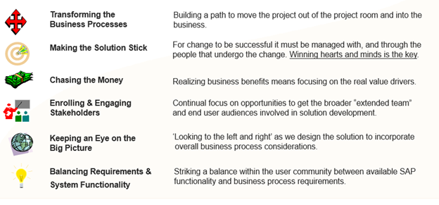 Benefits can only be fully realized if technology applications are implemented ‘hand in hand’ with an effective Change Management initiative. Such an initiative will help the Project Team stay focused and deliver results.